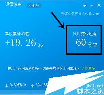 4:注冊并登錄以后,我們就會發現,迅雷快鳥的提速提示,不一定像提示說的那么神奇,能將4M網速提升至30M,但是提速確實很明顯,我們點擊“開始試用”。