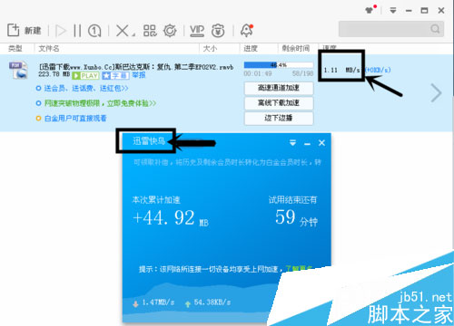 7:最后,依據下圖,我們一起來比較一下開啟“迅雷快鳥”前后的下載速度吧,之前:200多kb每秒;開啟之后可以達到1M多每秒!