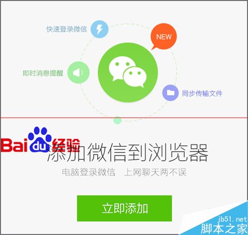 1、在新下載安裝的瀏覽器中,我們打開它的瀏覽器就可以在它的頁面中看到有一個添加微信到瀏覽器的頁面。然后在它的下面還有一個立即添加的字。如果我們想要進行一個添加的話,就直接點擊下面的立即添加。