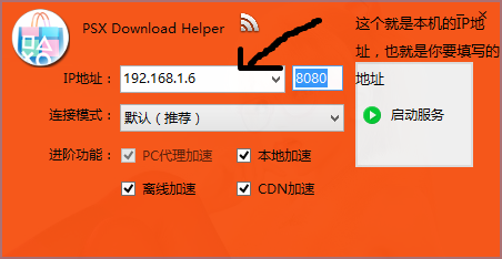 第一個啟動PSXDownloadHelper,點擊“啟動服務”(把IP地址記住,這里是192.168.1.16)