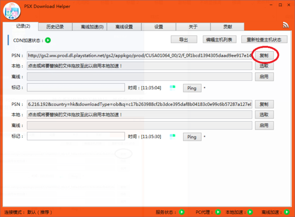 然后我們在電腦上點開PSXDownloadHelper,就會看到截取的下載地址。然后在PSN后面點擊復制,把地址復制到下載軟件那里(有些時候會彈出兩個地址,你都復制下載,如果是同一個文件就下載其中一個就行了)