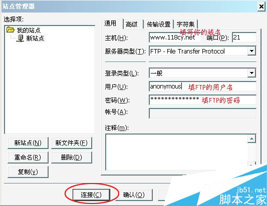 注意: 1、主機要填有www的域名,例如您的域名是abc.com,則填入www.abc.com 2、新開通的域名需要6-12小時才生效,如果您的域名新開通,請等域名生效后才能連接FTP。 3、如果忘記您的FTP帳號密碼,請先我們網站首頁登錄會員,點左邊的“虛擬主機管理”再點右邊的“管理”按鈕,可以看到您的ftp帳號和密碼。 5、連接成功后就會看到如下圖所示