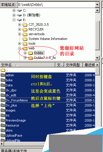 7、把您做好的網站傳到wwwroot目錄下。注意:不要把網站根目錄也上傳,只需傳網站根目錄里面的文件和文件夾。例如你的網站是放在DVBBS的文件夾里面,則DVBBS這個目錄不需要傳,只需傳DVBBS里面所有的文件和文件夾,如下圖