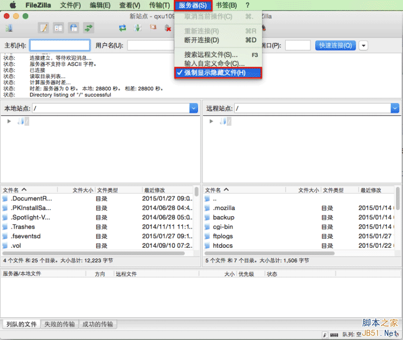 三、顯示隱藏文件:點擊“服務器”—“強制顯示隱藏文件”;