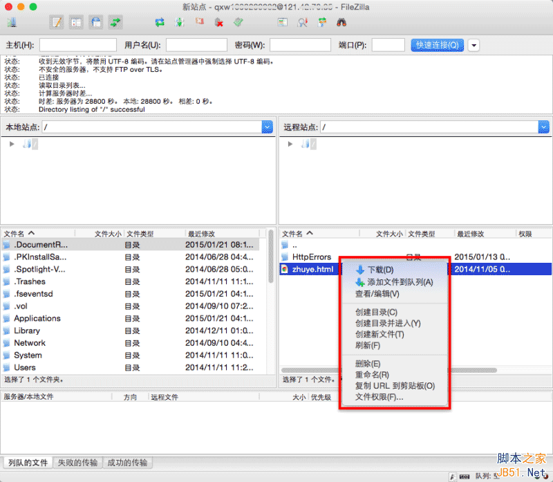 2、鼠標右鍵點擊本地站點或遠程站點上的相關文件及目錄可進行,創建新文件、刪除、重命名、移動、屬性、等操作;