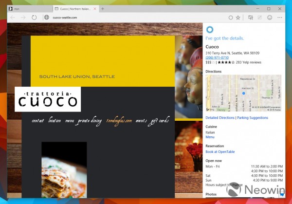 如果你打開了餐館或者零售店的網(wǎng)站,Cortana能夠顯示營業(yè)時間、菜單、消費(fèi)評價、商店所在位置和商店圖片在內(nèi)的實用信息。所有這些信息都會出現(xiàn)在屏幕的右側(cè),這樣用戶不需要再打開額外的頁面來檢查店家的相關(guān)信息。