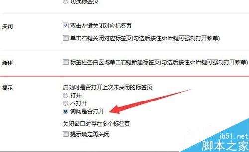 6、如果你還想顯示是否打開(kāi)的提示,只需要選擇下面的“詢問(wèn)是否打開(kāi)”項(xiàng),這樣以后打開(kāi)淘寶瀏覽器,就會(huì)提示是否打開(kāi)未關(guān)閉的標(biāo)簽頁(yè)面。