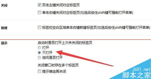 5、在窗口的右側(cè),找到“啟動(dòng)時(shí)是否打開(kāi)上次未關(guān)閉的標(biāo)簽頁(yè)”一項(xiàng),選中下面的“不打開(kāi)”選項(xiàng),這樣以后再打開(kāi)淘寶瀏覽器的時(shí)候,就不會(huì)再打開(kāi)上次未關(guān)閉的標(biāo)簽頁(yè)了