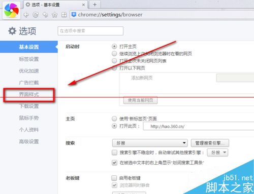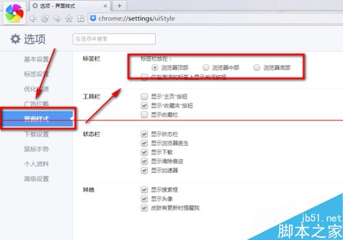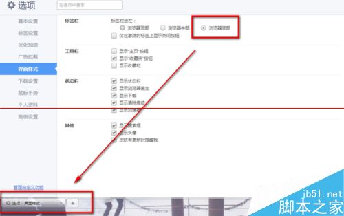 4、在界面樣式中第一行有標(biāo)簽欄位置,在瀏覽器底部前面的圈內(nèi)打上勾即可
