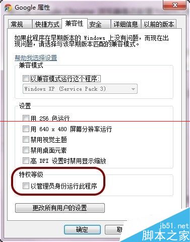 7、可以右擊Chrome快捷方式圖標,點擊“屬性”,在其中“兼容性”的“特權(quán)等級”中,確認未勾選“以管理員身份運行此程序”