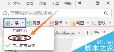 2、然后就會在收藏夾的右側(cè)看到一些之前安裝過的插件,我們點擊最左側(cè)“擴展”下的三角下拉按鈕,然后選擇“管理插件”