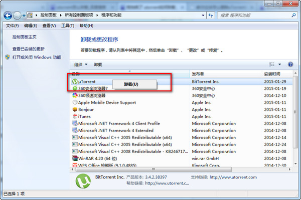 2、如果上述方法不管用,那么可以進入電腦的控制面板刪除應用程序,步驟為:開始——控制面板——程序和功能——右鍵uTorrent,點擊卸載