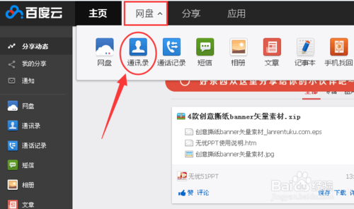 2、進入百度云首頁,找到底部菜單欄的網(wǎng)盤,鼠標移動過去會彈出一個下拉框,點擊選擇通訊錄