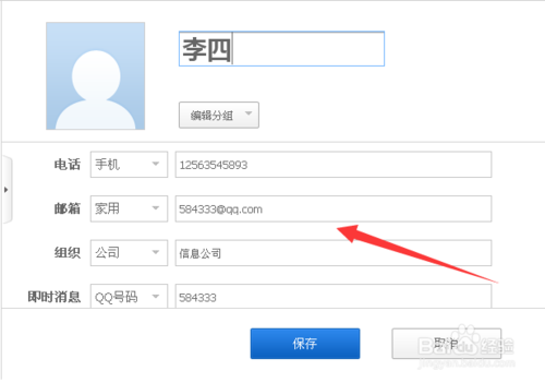 4、在彈出的新建聯(lián)系人窗口,把所需要添加的聯(lián)系人的姓名、電話、地址等信息添加上,然后點擊保存。