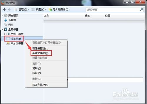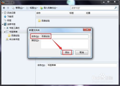 5、選中【書(shū)簽菜單】,點(diǎn)擊右鍵,右鍵菜單點(diǎn)【新建文件夾】,修改【名稱】后,點(diǎn)擊【添加】,這里添加了兩個(gè)文件夾即兩個(gè)書(shū)簽分類,如圖所示: