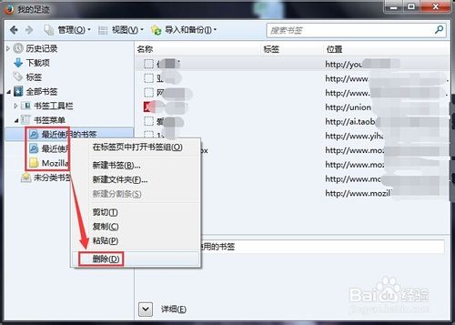 4、在書(shū)簽管理界面中,將【書(shū)簽菜單】下火狐默認(rèn)推送的書(shū)簽全部刪除,選中書(shū)簽,點(diǎn)擊右鍵,右鍵菜單點(diǎn)【刪除】即可,如圖所示: