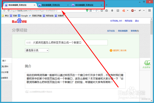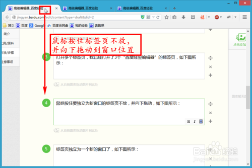 3、打開(kāi)多個(gè)標(biāo)簽頁(yè),我已經(jīng)打開(kāi)了3個(gè)“百度經(jīng)驗(yàn)編輯器”的標(biāo)簽頁(yè),如下圖所示:
