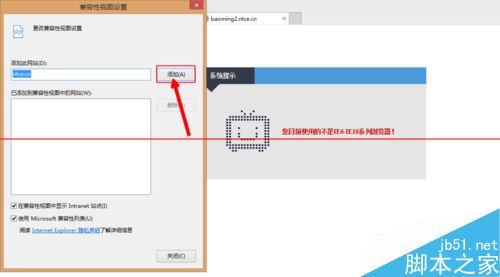 4、在“添加此網站”后,直接點擊“添加”,把該網站添加到兼容性視圖中,點擊“關閉”
