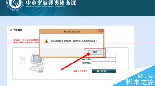 1、進入報名界面后,出現“系統目前不支持IE11”,點擊“確定”