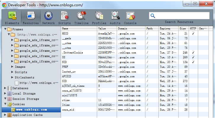 Resources標簽頁可以查看到請求的資源情況,包括CSS、JS、圖片等的內容,同時還可以查看到存儲相關的如Cookies、HTML5的Database和LocalStore等,你可以對存儲的內容編輯和刪除。