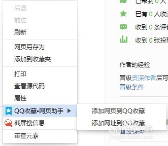5、在需要收藏的頁面,右鍵單擊,彈出菜單中會出現(xiàn)QQ收藏選項,選擇添加頁面到QQ收藏。