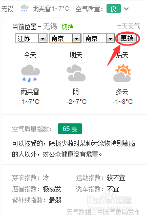 4、城市選擇完成后,點擊【跟換】按鈕,完成城市天氣切換,如圖所示: