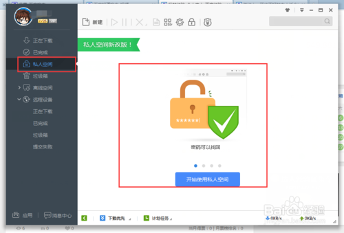 2、點擊迅雷左邊工具欄的“私人空間”,在右側點擊“開始使用私人空間”。