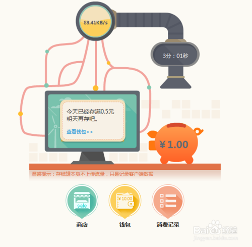 3、打開(kāi)存錢(qián)罐,便可看見(jiàn)里面有關(guān)于流量上傳和轉(zhuǎn)換成錢(qián)的動(dòng)畫(huà)了。