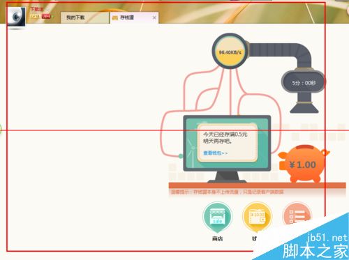 6、然后可以看到,每個(gè)5分鐘,就會(huì)存入1毛錢(qián)的樣子,不一會(huì)兒就存滿了。一天可以存入上限5毛,一個(gè)月存入上限是10元。這些錢(qián)可以用來(lái)兌換迅雷的會(huì)員等等,點(diǎn)擊“商品”進(jìn)行查詢兌換。
