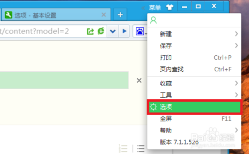 2、這時通過瀏覽器工具欄上的菜單,打開“選項”,進入設(shè)置;