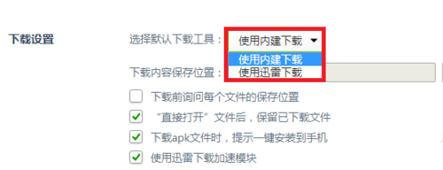 4、下拉“選擇默認下載工具”,切換到“使用內(nèi)建下載”,自動保存設(shè)置;