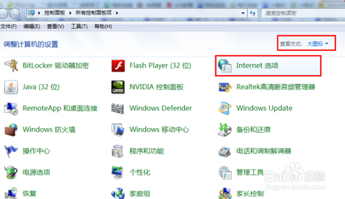 7、如果還是有問題,請做:控制面板—查看方式選"大圖標"—internet選項