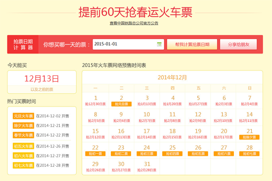 2014農歷馬年是閏年,共計384天,有2個九月,導致2015年的寒假非常的長,如果還是以前提前20天的火車票預售方案,相信很多學生們寒假都開始了,火車票都還沒買到。為了方便大家順利回家,近日,中國鐵路總公司正式公布,今年12月6日,火車訂票預售期延長至60天,即12月7日起,可提前60天開始發售2015年鐵路春運第一天的火車票。