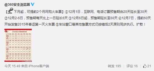 與此同時,作為億萬網民搶票必備的360瀏覽器官微同步發布,今年春節,使用360瀏覽器將可提前60天搶票回家,一起幫助鐵道部共同緩解春節搶票難題,全力幫助廣大網民能夠安全、安心、順心回家過節。據了解,截至目前,360瀏覽器已累計搶票近8000萬張,是億萬網民公認搶票王。