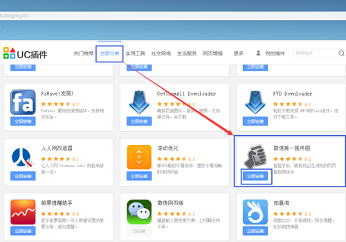 2、進(jìn)入插件頁面后,在全部分類中,找到“微信搖一搖傳圖”點擊“立即安裝”如下圖所示: