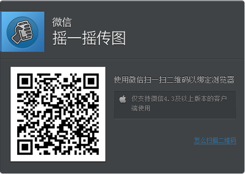 5、點擊“微信搖一搖傳圖”圖標(biāo),在彈出的二維碼中,使用微信掃一掃二維碼以綁定瀏覽器,這樣就可實現(xiàn)uc瀏覽器和微信功能,進(jìn)行互動使用了。