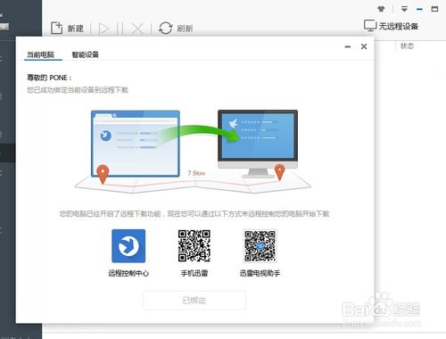 4、當(dāng)軟件提示我們智能設(shè)備已經(jīng)綁定成功以后,我們就可以享受遠(yuǎn)程下載啦,具體的方法是當(dāng)我們?cè)趧e的電腦上使用迅雷軟件的時(shí)候,使用迅雷賬號(hào)登陸遠(yuǎn)程下載頁(yè)面。