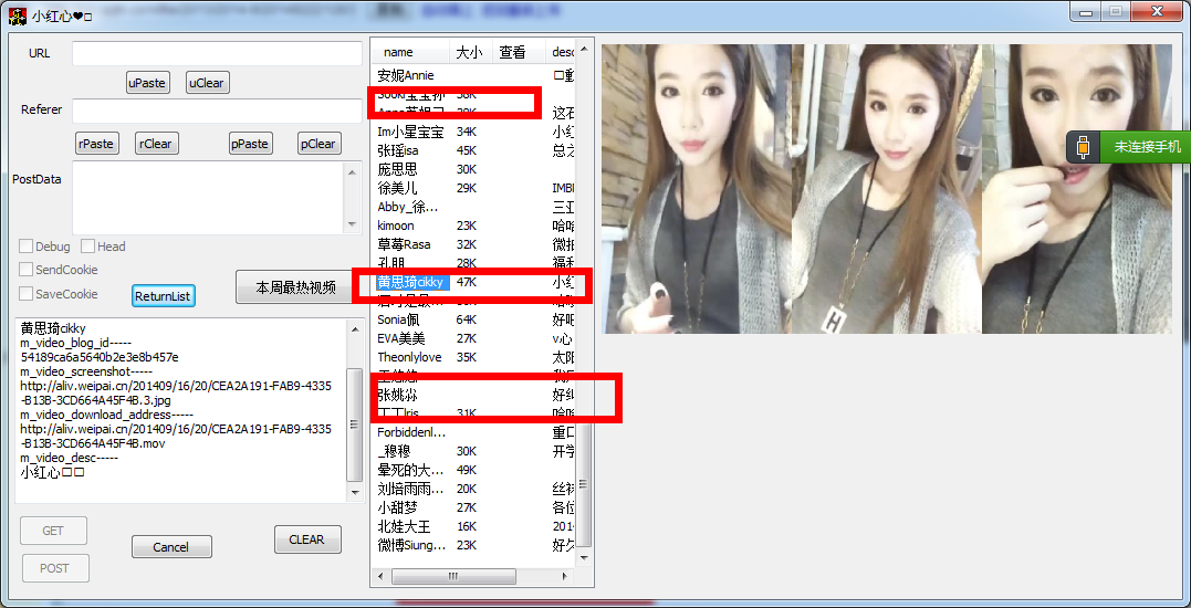 3、隨便點擊列表中的一個用戶名,即可查看到對應的圖片視頻信息,左下側就是微拍視頻地址