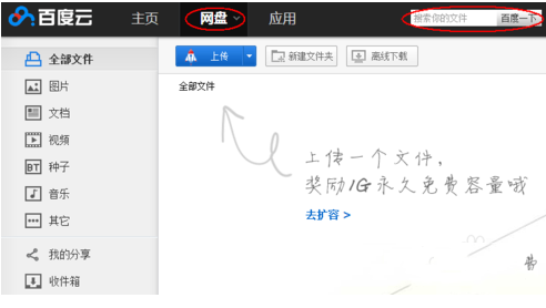 4.百度云進入后在網盤欄目中可以看到百度一下的搜索框,但是這個搜索框只是用來搜索自己的資源和內容的,并不能全網搜索資源。