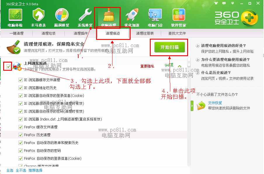 第2步:在打開的360安全衛(wèi)士中,單擊“電腦清理”下的清理痕跡選項(xiàng)卡,并勾選中“上網(wǎng)瀏覽痕跡”此項(xiàng),然后單擊“開始掃描”按扭。