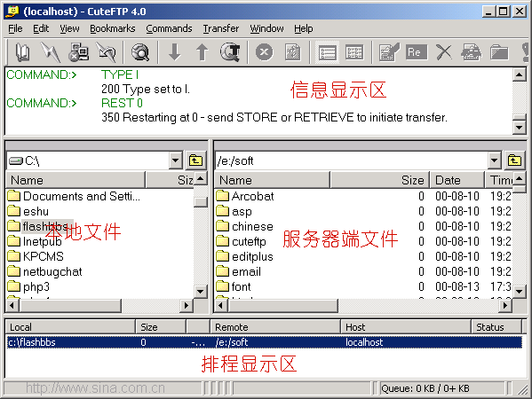 本地文件區(qū):這里顯示的是你的硬盤要上傳(upload)及要下載(download)的所在目錄,未設(shè)定前默認顯示的是CuteFTP的的安裝目錄(如c:/programs files/cuteFTP)。當然,如果我們不想把下載下來的文件都放在這里(我也不贊成您養(yǎng)成不明確分類、隨便存放下載文件的壞習慣,不然以后數(shù)據(jù)備份和查找就變成一件非常困難的事情),在后面講到的軟件設(shè)置過程中我們可以自由的設(shè)定存放的目錄。