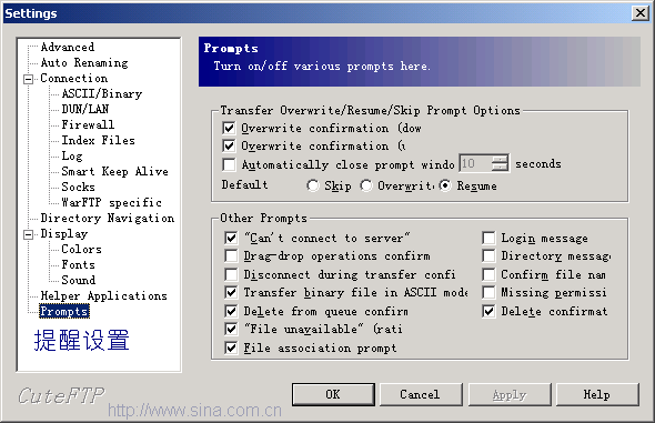 沒有比誤操作丟失或者損壞文件更令人沮喪的事情了。對于有些操作,您還是小心為好。舉例來說,辛苦下載回來的70多M的IE5壓縮包,可能有些時候被您“輕松”的就覆蓋掉。為此,在您辛苦沖浪頭大的時候,還是讓CuteFTP來體貼的多給你些提醒為妙。這里就CuteFTP的“Prompts:提醒”的善意提醒功能相關(guān)設(shè)定作一個特別的說明。