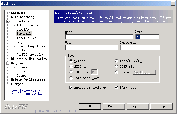 這里是關(guān)于CuteFTP的防火墻和代理服務(wù)器設(shè)置。防火墻的設(shè)置我就不多說了,如果您使用Wingate之類的工具共享MODEM上網(wǎng),您的CuteFTP可以軟件設(shè)置說明進行相應(yīng)的設(shè)置,這里我們主要介紹使用代理服務(wù)器的用法。大家已經(jīng)知道,在某些場合恰當?shù)氖褂么矸?wù)器,可以提供上載和下載的速度,并可以到達無法正常到達的站點。見圖防火墻設(shè)定,要使用代理服務(wù)器,需要進行下面的設(shè)置。