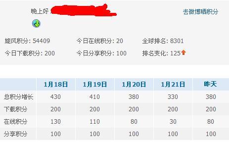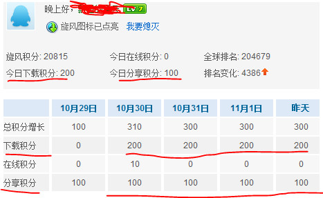 至于100微博分享積分嘛,按它10次分享就行,同一個文件可以多次分享,若提示分享時間過快,那就等幾秒再分享,反正夠10次就有100分享積分了。這樣幾分鐘之內就可以拿到300旋風積分,希望對你有用。那樣就每天再隨便掛幾個小時的話,每天就有300多400分QQ旋風積分了,這樣就可以快速升級的了,QQ旋風的高級用戶都這么弄的