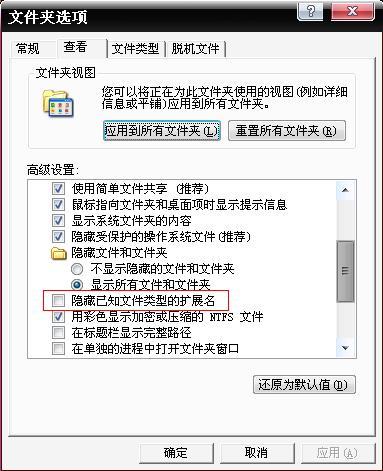 7、顯示已知文件類型的擴展名,操作步驟:打開“我的電腦”—“工具”—“文件夾選項” —“查看”—“隱藏已知文件類型的擴展名”去掉前面的勾