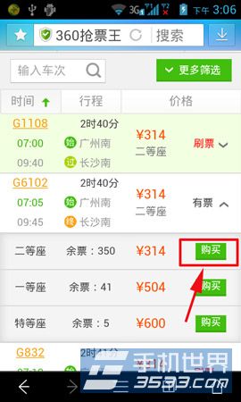 3)點擊購買后,找到你要的班次和席別,點擊“購買”。