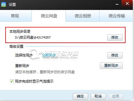3、微云網盤設置界面中我們可以設置同步的目錄,安裝完成后會自動新建同步目錄,這里我們可以自己新建一個并添加此目錄為默認同步目錄。