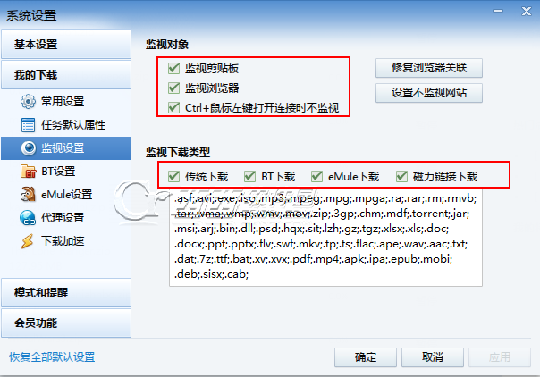 2、選擇我的下載→監(jiān)視設(shè)置,勾選監(jiān)視對象與監(jiān)視下載類型中的所有選項(xiàng)。