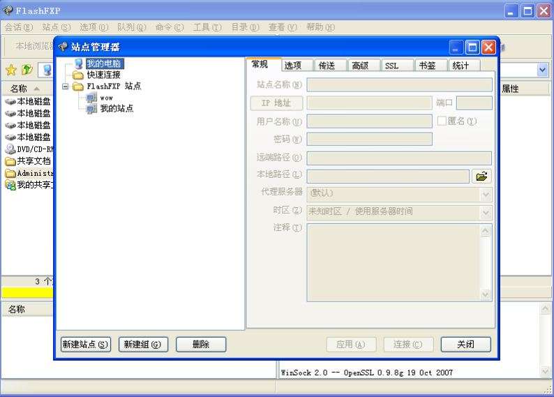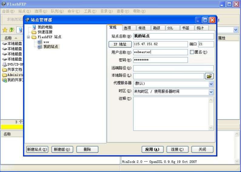 建立新站點后,如上圖,下一步需要做的是輸入“IP地址”、“用戶名稱”、“密碼”,其他設置不需要填寫,見下圖,然后點擊“連接”按鈕。
