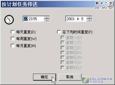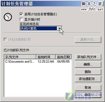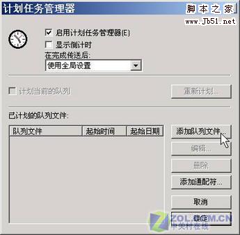 選擇“傳送”→“按計劃任務傳送”,在打開的窗口中選中“啟用計劃任務管理器”復選框,再單擊“添加隊列文件”按鈕(如圖2)。打開先前保存的ccu.que,接著,在打開的(如圖3)所示的窗口中設置定時上傳時間。按下“確定”按鈕即可把它添加到當前列表中(如圖4)。